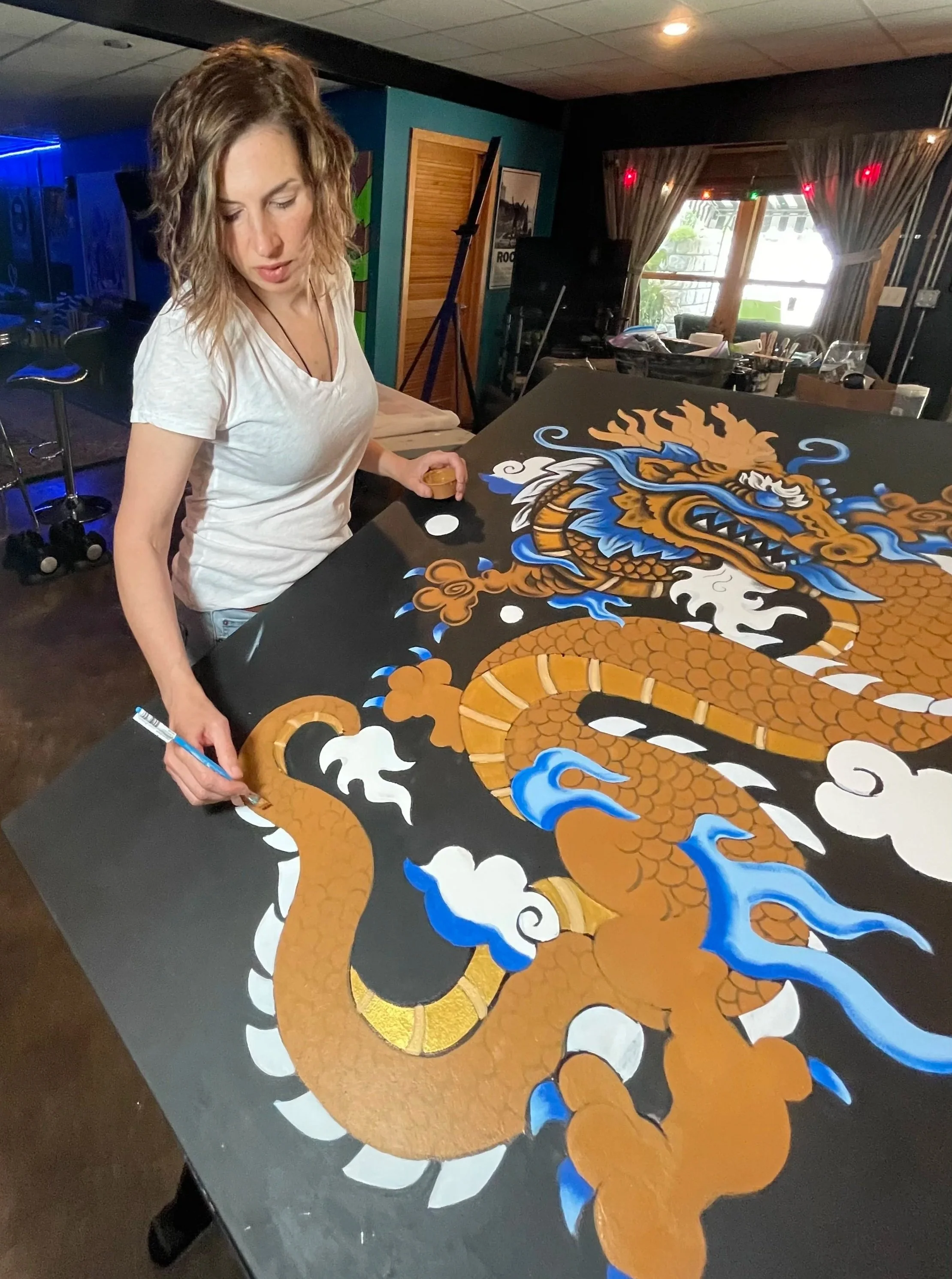 JFo is a naturally gifted illustrator & painter. Never having a single lesson in the creation of art, she has been drawing since she could hold a pencil. People who’ve known her would call it an obsession. She would call it natural & necessary. Her imagination and drive to express what she envisions are truly inexhaustible. Only a decade ago, she picked up a paint brush for the first time and quickly took to the medium of acrylics and larger-than-life canvases. And in true JFo fashion, nothing pleases her more than painting her illustrations from floor to ceiling on a wall.